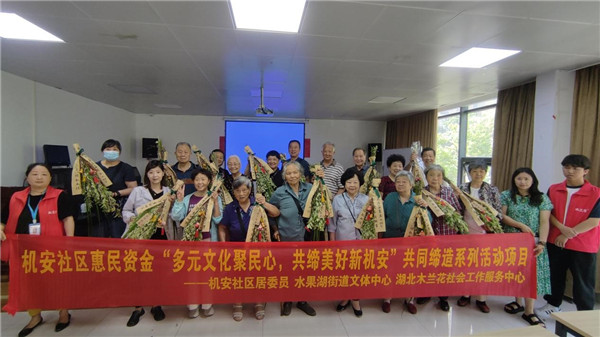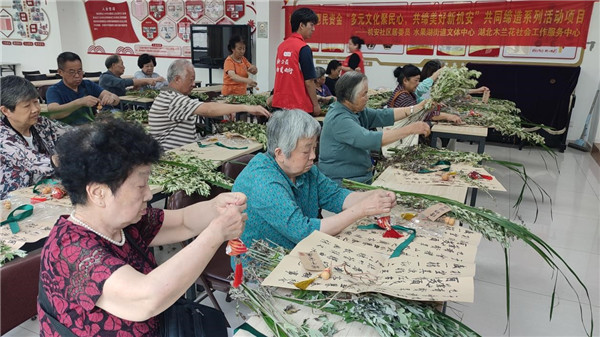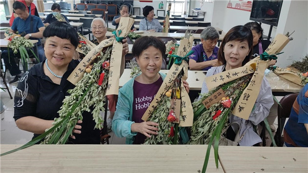 緊接著,活動(dòng)進(jìn)入了高潮環(huán)節(jié)——艾草花束DIY。悠悠艾草香,綿綿情意長(zhǎng)。艾草花束的制作,采用我們熟知的新鮮艾草、鮮花和香包等作為主材,制作成清香怡人的特色花束,寓意著驅(qū)役納福,送人或懸掛自家門(mén)前,都很實(shí)用。艾草花束賦予了傳統(tǒng)節(jié)日新的時(shí)代內(nèi)涵,受到了居民喜愛(ài)。在老師的指導(dǎo)下居民們從挑選艾草、搭配香囊、小葫蘆、五彩繩、印著蘭亭序詩(shī)集的牛皮包裝紙親手綁扎。每一步都充滿了細(xì)致與巧思,艾草的綠色與紅色、黃色配飾的搭配。不僅展現(xiàn)了端午的傳統(tǒng)元素,也融入了現(xiàn)代審美。參與活動(dòng)的老年居民及少數(shù)民族居民紛紛表示通過(guò)“親手制作,更加深刻地感受到了端午文化的魅力”。