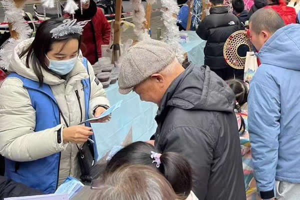 活動現(xiàn)場,鑼鼓聲響,舞龍船表演隊伍在人群中穿梭,腰鼓隊帶來傳統(tǒng)民俗表演,氛圍十分熱烈。傳統(tǒng)美食區(qū)以雪花、雪屋、雪人造型設(shè)置了十余個民俗攤位,不僅提供有特色的東北凍梨、東北粘豆包、糖葫蘆等傳統(tǒng)美食供居民品嘗,還邀請居民們一起掛新年燈籠、寫對聯(lián)。
