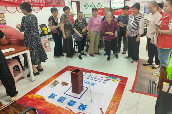 包完粽子,活動(dòng)中心大廳搖身一變,成了傳統(tǒng)游戲的歡樂場。工作人員提前布置好投壺道具,古色古香的壺口與箭矢吸引老人們躍躍欲試?!拔夷贻p時(shí)可是投石子高手!”76歲的周爹爹自信滿滿地拿起箭矢,卻因手抖偏出壺口,引來一陣善意的哄笑。楊阿姨在志愿者指導(dǎo)下,輕輕一投,箭矢穩(wěn)穩(wěn)落入壺中,贏得陣陣掌聲。老人們你投我笑,在傳統(tǒng)游戲中重溫兒時(shí)樂趣,現(xiàn)場洋溢著輕松愉悅的氛圍。