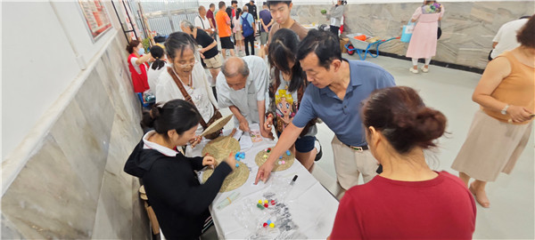 社工早早的來到蛇山人防納涼點進行布場,金黃的南瓜搭配著沉甸甸的麥穗,竹筐和簸箕搭建出小谷倉。活動開始后,人頭攢動。“推車運糧” 處,頭發(fā)花白的老爺爺緊握車把,沉穩(wěn)推車,笑容慈祥;“蔬果連連看” 攤位,幾位大媽圍著展板,時而討論時而蹙眉,戴眼鏡的大媽反應敏捷,很快找出多對相同蔬果,面露得意;果撈仙草凍臺前香氣四溢,幾位老奶奶圍坐品嘗,不時贊嘆;“DIY 蒲扇” 區(qū),居民們認真涂鴉,或畫花草或?qū)?“立秋”;果蔬套圈場地熱鬧,中年大叔瞄準西瓜,扔出的套圈穩(wěn)穩(wěn)落下,引來歡呼。各色身影穿梭,笑語不斷,滿是歡樂氛圍。