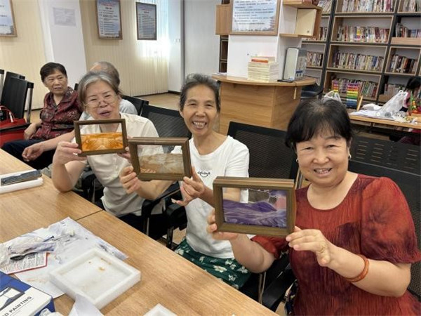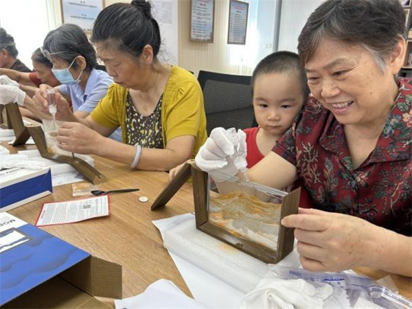 知識分享后,創(chuàng)意十足的流沙畫相框手工環(huán)節(jié)登場。兩種飽含美好寓意的顏色流沙畫 —— 橘色 “背靠金山”、紫色 “紫氣東來”,成為居民們創(chuàng)作的主角。大家圍坐在一起,小心將細(xì)膩流沙注入古樸木框,看著流沙緩緩傾瀉、堆積,或勾勒出層巒疊嶂的山水輪廓,或暈染出夢幻的色彩層次,原本普通的流沙,在巧手下變成獨特的藝術(shù)作品。創(chuàng)作過程中,居民們相互交流技巧、分享創(chuàng)意,歡笑聲與討論聲交織,讓社區(qū)活動室滿是溫馨。