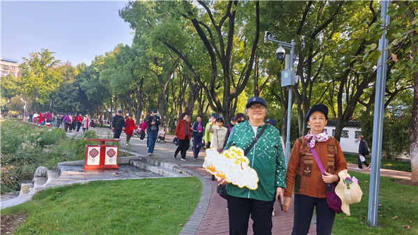 抵達(dá)公園后,健步活動正式開啟。1.5 公里的湖邊步道平坦無陡坡,老人們戴著統(tǒng)一的定制棒球帽,三五成群,伴著秋風(fēng)與花香緩緩前行。社區(qū)還在古亭、桂花林、親水棧道設(shè)置了 3 處 “秋日打卡點”,準(zhǔn)備了茱萸香囊、書法折扇等重陽節(jié)主題道具?!皝恚蹅兡弥隳液蠌堄?!”72 歲的王阿姨拉著鄰居李阿姨,在桂花樹下留下了開心的笑容,工作人員則在一旁講解著武昌地域文化與公園生態(tài)知識,讓健步行變成了 “邊走邊學(xué)” 的文化之旅。中途休息時,老人們紛紛拿出能量包里的牛奶和蛋糕,邊補充能量邊交流沿途見聞,氛圍格外融洽。