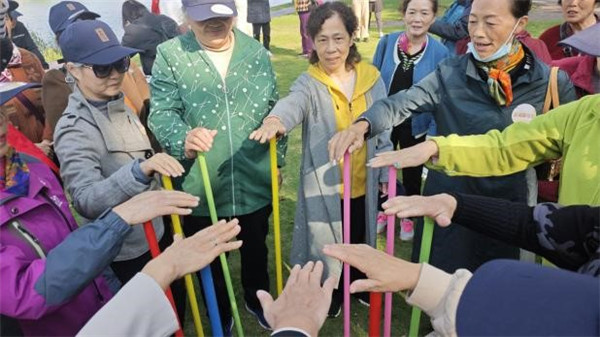健步結(jié)束后,古戲臺前的空地上熱鬧起來 ——“不倒森林”“珠行萬里” 兩項輕量拓展游戲接連開展。在“不倒森林” 中,老人們圍圈手持塑料桿,相互配合保持桿子不倒;“珠行萬里”游戲里,大家 5-6 人一組,用U型槽接力傳送小球,現(xiàn)場不時響起陣陣笑聲。社區(qū)還為獲勝小組額外準(zhǔn)備了重陽糕,不少平時僅在社區(qū)偶遇的老人,通過游戲組隊熟悉起來,分享著各自的生活趣事,社交壁壘在歡樂中悄然打破。