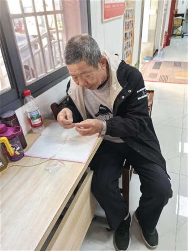 專業(yè)手工老師從最基礎(chǔ)的步驟教起,手持穿針器放慢動(dòng)作演示:“先把線穿過針孔,留個(gè)小線頭打個(gè)結(jié),這樣珍珠就不會(huì)滑掉啦?!笨吹接欣先瞬[著眼睛半天穿不上線,老師立刻走過去,握著老人的手一起調(diào)整角度;遇到手部微微顫抖的老人,志愿者便蹲在身邊,輕輕扶著他們的手腕,陪著一起慢慢穿珠?!袄罾蠋?,你看我這顆珍珠放在中間好不好?”家住1棟的楊阿姨舉著半成品項(xiàng)鏈,像孩子般期待地詢問,老師笑著點(diǎn)頭。