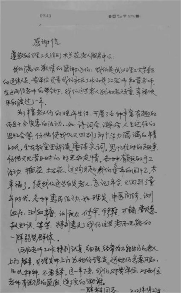 近日,理工大水運(yùn)社區(qū)老年服務(wù)中心的辦公室里暖意融融,接連收到的一面鮮紅錦旗與兩封字跡工整的感謝信,成為了這個(gè)冬日里最動(dòng)人的風(fēng)景。這些承載著老年居民深厚情誼的“禮物”,不僅是對(duì)服務(wù)中心工作的高度認(rèn)可,更生動(dòng)詮釋了“社區(qū)為老、情暖萬(wàn)家”的服務(wù)溫度,為寒冷的冬日注入了陣陣暖流。