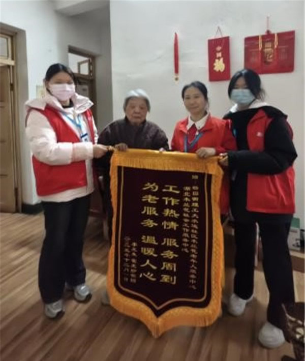 12月1日下午三點(diǎn),服務(wù)中心的黃老師帶著兩位同事,拎著剛采購(gòu)的刀削面,熟門熟路地來(lái)到社區(qū)南3棟301室——這是他們每月至少四次的固定探訪。屋內(nèi),長(zhǎng)期臥床的李光生爺爺正靠在床頭,膝蓋患有嚴(yán)重關(guān)節(jié)炎無(wú)法下樓的霍光珍奶奶則在一旁等候。看到工作人員進(jìn)門,霍奶奶連忙起身迎接,眼角滿是笑意。令眾人意外的是,這次探訪中,霍奶奶顫巍巍地拿出一面繡著“工作熱情 服務(wù)周到 為老服務(wù) 溫暖人心”的錦旗?!斑@一年多虧了你們,小到降壓藥、醬油醋,大到夏天的電扇、冬天的暖手袋,全靠你們跑前跑后,連家里壞了的電飯煲都是你們找人修好的。”霍奶奶的話語(yǔ)樸實(shí)無(wú)華,卻道出了老兩口最真切的感激。
