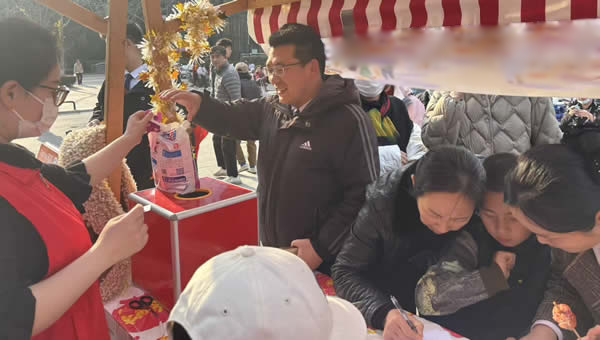 社區(qū)書法社志愿者現(xiàn)場揮毫潑墨,為居民書寫春聯(lián)、送上 “?!?字,筆墨飄香間傳遞新春祝福;非遺糖畫藝人手持工具勾勒龍鳳、生肖等吉祥圖案,晶瑩剔透的糖畫與酸甜可口的糖葫蘆,讓居民重拾童年記憶。剪窗花、制作燈籠攤位前更是熱鬧非凡,彩紙、剪刀、竹篾、絲帶等材料整齊擺放,居民們圍坐一堂,老人們耐心傳授折疊、裁剪、粘貼技巧,孩子們學(xué)得專注認(rèn)真,指尖翻飛間,一幅幅寓意吉祥的窗花(喜鵲登梅、年年有余)、一盞盞造型別致的燈籠逐漸成型,大家互相展示成品、分享技巧,歡聲笑語中滿是對新年的期盼,盡顯傳統(tǒng)民俗的獨(dú)特魅力。旋轉(zhuǎn)釣福馬、社區(qū)拼圖、新年趕年獸等游戲集章區(qū)攤位前人頭攢動(dòng),老少居民通力協(xié)作、踴躍參與,在趣味闖關(guān)過程中增進(jìn)鄰里交流;知識(shí)競猜環(huán)節(jié)圍繞社區(qū)建設(shè)、傳統(tǒng)文化、安全常識(shí)等內(nèi)容展開,既考驗(yàn)學(xué)識(shí)又增添樂趣,集章滿4項(xiàng)的居民收獲到各種精美小禮品。