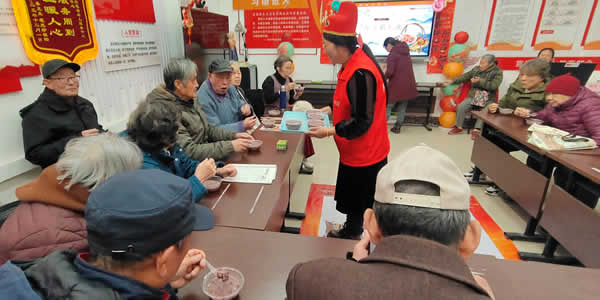 最令人期待的品粥環(huán)節(jié)暖意融融,工作人員早已熬制好香甜軟糯的八寶粥,將一碗碗熱氣騰騰的粥品遞到老人手中。粥香四溢,甜在口中、暖在心頭?!斑@粥太香了,和老伙伴們一起玩游戲、答題、喝粥,比在家熱鬧多了!”78歲的張奶奶笑著說。李爺爺也表示:“這樣的活動(dòng)既有趣又有意義,不僅感受到了節(jié)日氛圍,還拉近了鄰里情誼。”劉老師還現(xiàn)場即興賦詩一首,說出了參加活動(dòng)老人的心聲。最后,社工們還上門給行動(dòng)不便的高齡老人送去了香甜的八寶粥,老人們感動(dòng)不已。