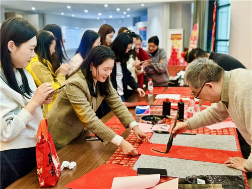 書法愛好者們揮毫潑墨,筆尖在紅紙上流轉(zhuǎn)。